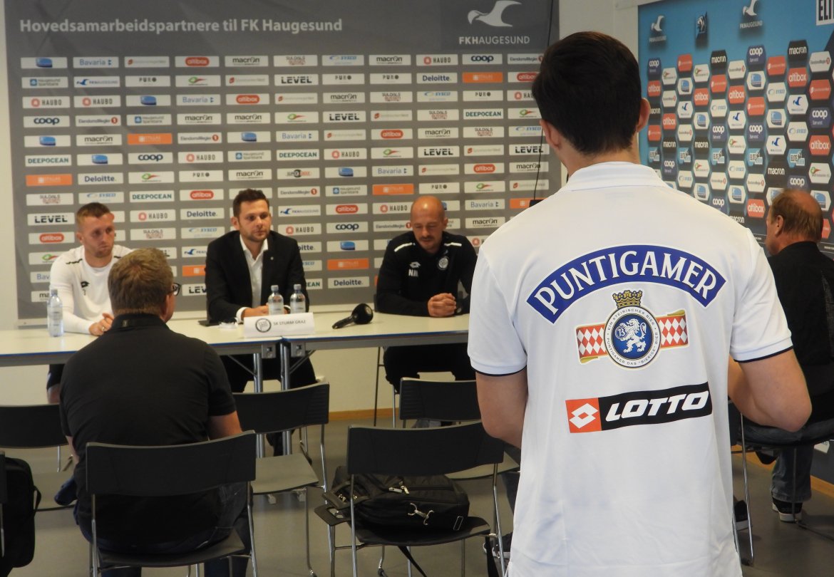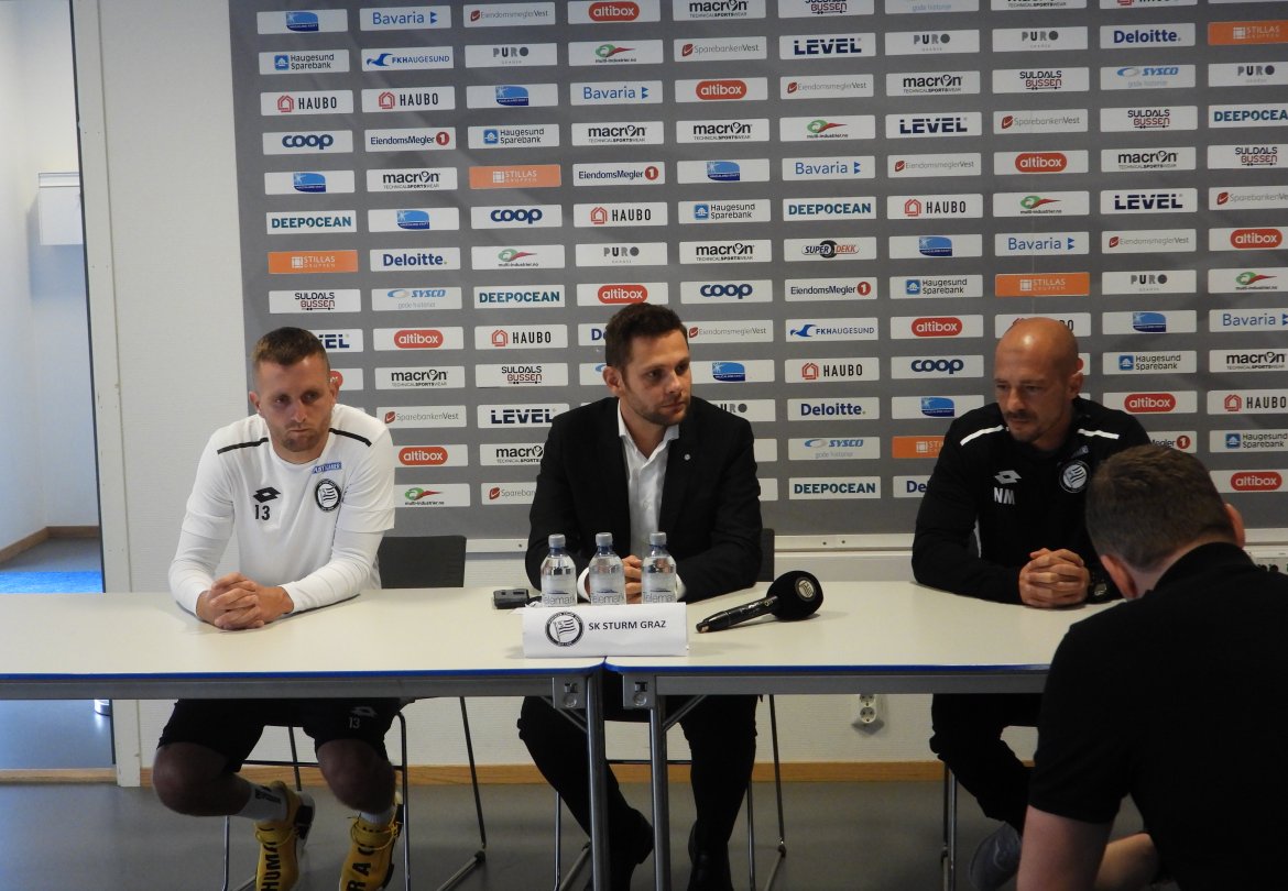 SK Sturm Graz ankom Haugesund onsdag formiddag og gjennomførte siden en lett treningsøkt på Haugesund Stadion senere på ettermiddagen. Før treningsøkten holdt laget også en pressekonferanse hvor hovedtrener Nestor El Maestro og midtbanespilleren Jakob Jantscher serverte sine betraktninger før torsdagens oppgjør.