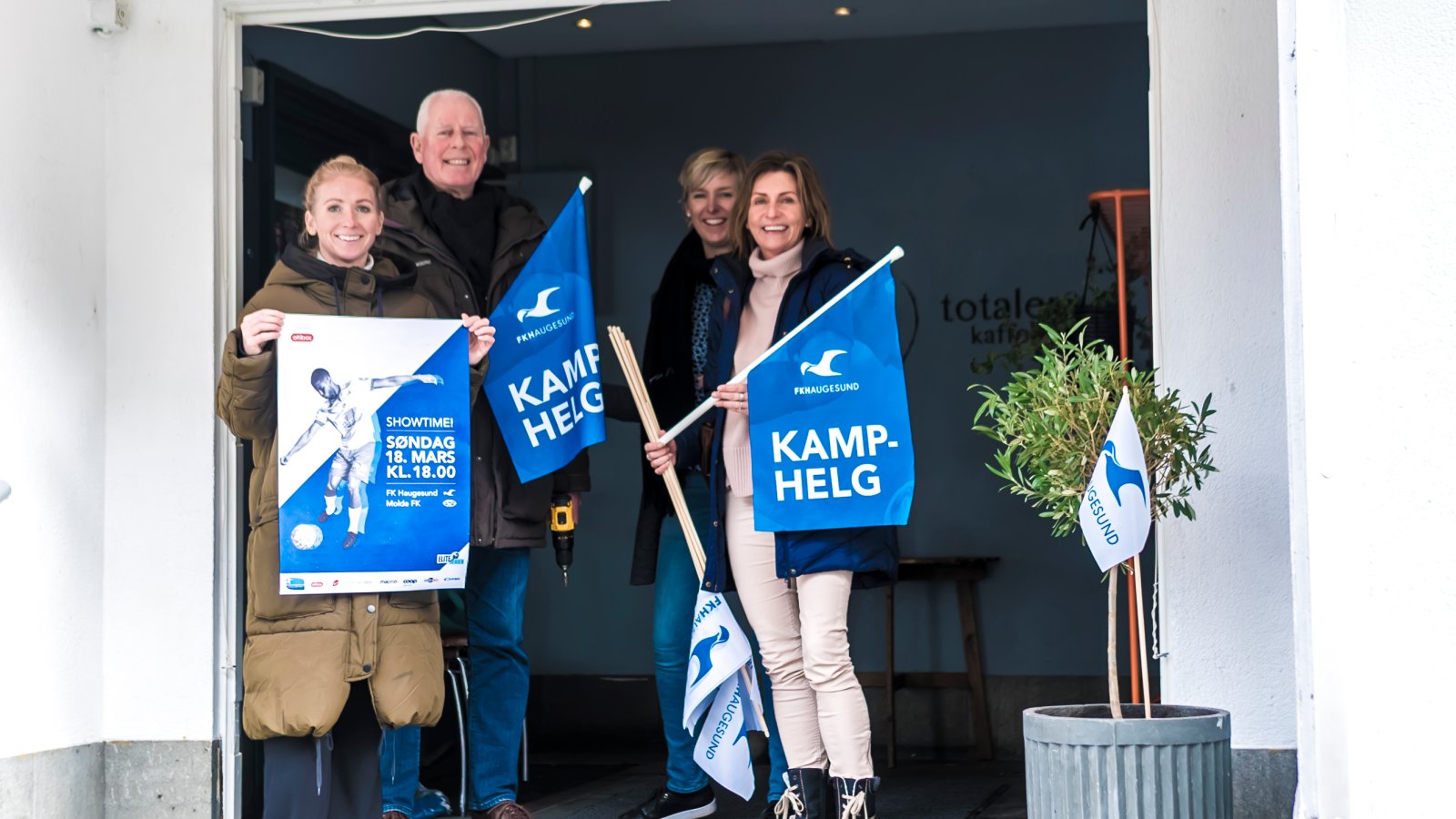 Tina Røvær og Tina Lønning i FK Haugesund brukte mandag formiddag sammen med Fossan Waage jr. på å besøke de ulike forretningene i sentrum og overrekke kampdagsflaggene. Deriblant Totalen Kaffebar.