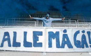 FK Haugesund i gult, hvitt og blått.